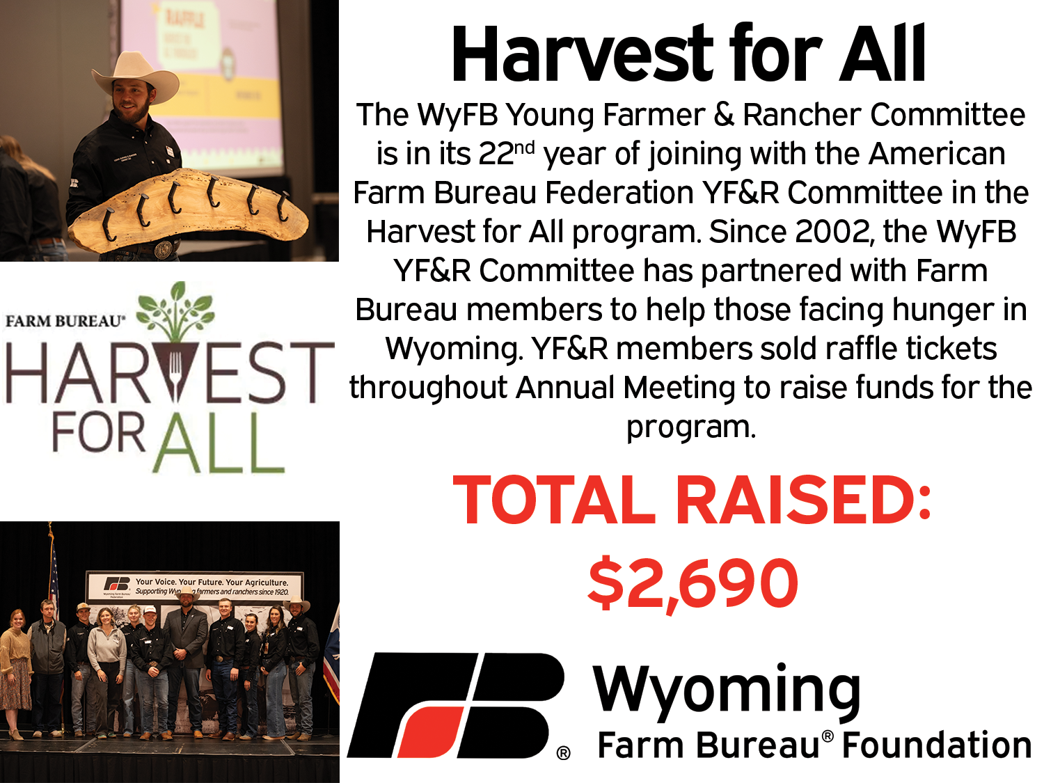The WyFB Young Farmer & Rancher Committee is in its 22nd year of joining with the American Farm Bureau Federation YF&R Committee in what is called a “Harvest for All.” Since 2002, the WyFB YF&R Committee has partnered with Farm Bureau members to raise 6,044 pounds of food, $36,278 and 134 hours of volunteer time to help those facing hunger in Wyoming.